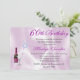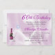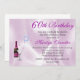 Lovely birthday party invitation made with graphics of a pink satin looking background. A bottle of champagne and glass on the left side of the invitation, with whimsical coloured bubbles raising up. Personalise all the text to suit your party needs. Very pretty invitation for a ladies party.