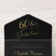 Elegant 60th birthday party all-in-one black invitation featuring "60 & Fabulous" and your name showcased in chic calligraphy scripts, the party details in modern lettering, and a white tear away RSVP postcard for a convenient envelope-free response option for your guests. All the text on the inside of the invitation is rendered in your choice of genuine gold, silver or rose gold foil.