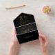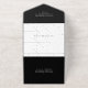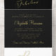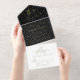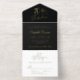 Elegant 70th birthday party black all-in-one invitation featuring "70 & Fabulous" and your name showcased in chic calligraphy scripts, your party details in modern lettering, and a white tear away RSVP postcard for a convenient envelope-free response from your guests. All the text on the inside of the invitation is rendered in your choice of genuine gold, silver or rose gold foil.