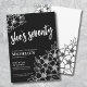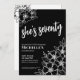 Elegant Seventy Black White 70th Birthday Party Invitation. A fun but elegant 70th birthday party invitation with girly black and white flowers for the young at heart. A playful flower pattern frames a script typography "she's seventy" mixed with a more classic serif font. Celebrate seventy years of life with this beautiful botanical design. The fun part is you can change out ALL of the colours!! You can not only change the background colours and font, but you can change the lines for the flowers as well.