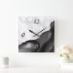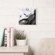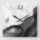 Elegant modern white marble and black agate trimmed with faux rose gold glitter combine in this luxurious square wall clock. The numbers 3 and 6 appear in light grey on the black agate background, while the numbers 9 and 12 appear in black on the white marble.