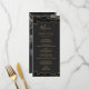 This elegant, modern wedding menu features top and bottom borders of black watercolor agate trimmed with gold faux glitter. The text appears in elegant gold-coloured handwriting, italic and copperplate fonts on a slate black background. The agate design is repeated on the reverse.