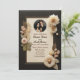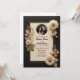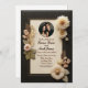 • This elegant wedding invitation features a black leather-textured frame with gold accents and intricate floral details. The design includes space for a photo of the couple, adding a personal and memorable touch. Perfect for formal weddings, it combines luxury and sophistication in a timeless style.