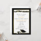 Stylish graduation party invitation, done with a white background and a black and gold tone frame. Graphics of a black and gold banner, across the top, and a diploma and mortarboard cap, on the bottom. Personalise the year and rest of the invitation's text to suit your party needs.