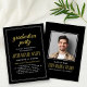 Elegant two-sided graduation announcement card and party invitation features a classic black, white and gold colour scheme (can be modified) with deco style frame that frames the custom invitation wording on the front. The back of the card features a senior photo of the grad with class year and school information that can be personalised. Photo tip: crop your photo to a square format before uploading to the site.