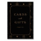 This elegant wedding tabletop sign features a sophisticated black and gold colour palette, creating a luxurious contrast. The design showcases intricate celestial motifs with sunburst patterns and stars, arranged in a balanced grid layout around the edges. Central to the design is a clean rectangular frame with "CARDS and GIFTS" written in an uppercase serif font, complemented by a smaller cursive script for "and," followed by "THANK YOU" in a refined serif typeface. The overall style blends classic elegance with modern minimalism, perfect for expressing gratitude at your special event.