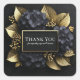 Make a powerful statement of modern luxury with this stunningly elegant floral thank you sticker. The design features a deep, textured black background, creating a dramatic and sophisticated canvas with a subtle shimmer. A beautiful arrangement of lush, 3D-style flowers, including deep indigo-black hydrangeas, peeks out from behind a central frame. The bouquet is dominated by large, brilliant, brushed metallic gold leaves and delicate gold berry sprays, which add a rich, high-end, and artistic feel. A chic, clean black rectangular frame with a minimalist gold border provides a sophisticated focal point for your text. These stickers are perfect for a luxury brand's product packaging, sealing a high-end jeweller's gift box, a couture fashion boutique to add to shopping bags, or for sealing black-tie wedding or gala invitations. This versatile design can also be used to beautifully seal envelopes for any formal event, or as a sophisticated accent on high-end gift wrapping and party favours.