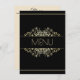 An Elegant Black and Gold Wedding Menu designed with gold coloured accents on a black background. The front text includes: MENU. The reverse text includes the full Menu details on a matching linen coloured background, with black border. To personalise, simply insert your text into our easy template, replacing the sample text.