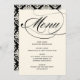 Elegant and formal wedding dinner menu cards feature black calligraphy script and a coordinating damask pattern on the back of the card. Ivory background colour.