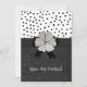 Elegant and whimsical, this black and white engagement party invitation, is done in black on black damask and a black on white polka dot pattern. Graphics of a black ribbon across the middle separates the two patterns, with a lovely black bow and white flower, in the middle of the ribbon. All text front and back side of the card are fully customisable for your special event. Great for birthdays, anniversaries, charity events, or what ever your occasion may be.