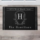 Elegant and classic custom doormat features a creast with family name initial in elegant style text and your family’s last name and address. Designed with clean stripe accents, this doormat offers a timeless look that can be personalised to match your entryway.