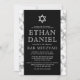 Elegant, modern bar mitzvah invitations with white marble texture borders and your invitation text in the centre on a black background with a white Star of David at the top. For more products, custom requests, sales, news and more, please follow us on Facebook: @chaistationery