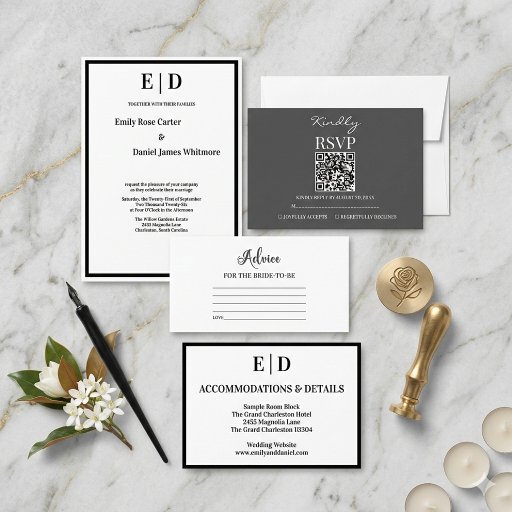 Elevate your wedding stationery with this Elegant Black and White Wedding Invitation Suite. Featuring a clean, timeless design, this set highlights a modern serif monogram and sophisticated typography. The minimalist aesthetic is framed by a bold black border, making it perfect for formal black-tie events, urban loft weddings, or classic garden ceremonies. This comprehensive suite includes a customizable invitation card, a matching RSVP card, and a coordinated details card to ensure your guests have all the information they need in one cohesive, stylish package.