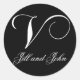 Elegant Black and White Monogram V with Names Stickers. Customise with your names and background colour