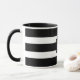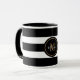 Enjoy your morning coffee in style with this Elegant Black And White Stripes Script Monogram Mug. This classy design has black and white horizontal stripes with black circle border on the front centre. Your monogram is in faux gold minimal lettering and personalised with name in white trendy hand lettered script. Click personalise template option and follow the prompts.