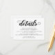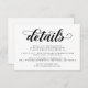Elegant simple black and white wedding details enclosure card features calligraphy script and details in trendy lettering.