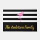 Let your visitors know they've reached the right home. You can add your family's name in faux gold script on the wide black stripe at the bottom. The background is black and white stripes. A pink flamingo is above the text.