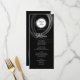 This modern menu features an artistic silver ring design surrounded by light grey wispy brush strokes overlaid on a midnight black background. A great choice for your metro wedding. Add your menu details by clicking the customise link. This is part of a collection with a matching napkins, table number cards and other wedding essentials.