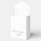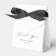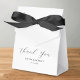 Minimalist wedding favour boxes featuring a simple white background, a black bow, the words "thank you" in a elegant script font, your names, and the wedding date.