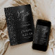 This elegant modern wedding save the date card features a black brushed metal background decorated with faux diamond glitter. The customisable text combines white script and sans serif fonts. The reverse side repeats the black brushed metal and glitter design.