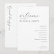 This elegant wedding program features a minimalist design with clean lines and ample negative space, creating a sophisticated and formal aesthetic. The color palette is simple, utilizing black text on a white background for high contrast and readability. The typography includes graceful cursive script for the welcoming message and bold serif fonts for the names and ceremony details, enhancing the visual hierarchy. Perfect for couples seeking a classic and timeless look, this program captures the essence of elegance and simplicity, making it ideal for any formal wedding occasion.