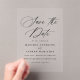 Elevate your wedding announcement with our exquisite acrylic save the date cards, designed for timeless elegance. Featuring "Save the Date" in graceful black calligraphy on a sleek, clear acrylic background, this design embodies simplicity and sophistication. Personalise your cards with your names, wedding date, location, and wedding website, displayed in bold black lettering for a modern, polished look. Perfect for couples seeking a chic and unique way to set the tone for their special day, these durable and customisable cards ensure your announcement is both stylish and unforgettable.