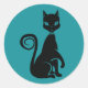 Elegant black cat posing with one paw raised. Has a cute curly tail and is wearing a fancy choker.