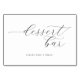 This elegant wedding tabletop sign features a minimalist design with the phrase "dessert bar" in flowing cursive script, inviting guests to indulge. The black text on a clean white background creates a sophisticated and timeless look, perfect for any event setting. Below, a friendly sans-serif font encourages guests with "PLEASE TAKE A TREAT!" adding a touch of whimsy. Ideal for creating a welcoming atmosphere at your dessert station, this sign combines modern style with approachable charm.
