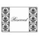 Custom Wording. Features an formal, classic, black damask design on white for an upscale sophisticated look. The graphic design makes a nice vertical border on each side with Reserved written in a formal text script. This classic pattern is large showing the filigree details. Wording can be changed on either side using one or two lines if necessary, or write Table numberinstead. Use Customise and change text font style using the F selection. And if needed, use the Arrows to centre the new font, or the Numbers to enlarge or reduce a new font to fit for your wedding or special event.