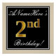 This simple and elegant birthday party poster design features a personalised message like "ANameHere’s 2nd Birthday!" (with the "2nd" having a faux/imitation gold-like colouring look) within a black-coloured square area featuring a simple border outline. The name is in an elegant white-coloured script-like text, and can be personalised. A personalised birthday party poster like this could perhaps be used as a decoration at a party being held for somebody who is celebrating their second birthday. [~Z0000236]