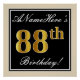 This simple and elegant birthday party poster design features a personalised message like "ANameHere’s 88th Birthday!" (with the "88th" having a faux/imitation gold-like colouring look) within a black-coloured square area featuring a simple border outline. The name is in an elegant white-coloured script-like text, and can be customised. A personalised birthday party poster like this could perhaps be used as a decoration at a party being held for somebody who is celebrating their eighty eighth birthday. [~Z0000236]