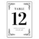 This elegant wedding table card features a minimalist design with a clean, white background and bold black typography. The layout is vertically oriented, showcasing the number "12" prominently in a large serif font, flanked by symmetrical floral motifs that add a touch of sophistication. Customizable text fields allow for personalization, making it perfect for marking special seating arrangements at your event. The overall style exudes formality and celebration, ideal for weddings or formal gatherings.