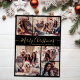 Modern Simple Elegant Calligraphy Black and Gold 5 Photo Collage Merry Christmas Script Holiday Card. This festive, minimalist, whimsical five (5) photo holiday greeting card template features a pretty grid photo collage and says „Merry Christmas”! The „Merry Christmas” greeting text is written in a beautiful hand lettered swirly swash-tail font script in gold on black colour background. On the reverse side with your greeting message template with a little heart doodle on white and one horizontal photo template. Pretty greeting card for your family and friends in Christmas Holiday season.