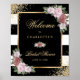 Elegant black and gold floral bridal shower welcome sign featuring blush pink flowers and greenery framing the event details inside a gold frame adorned with gold confetti against a black and white striped background. Matching items available.