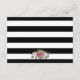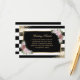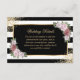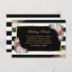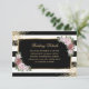 Elegant black and white striped floral wedding insert card featuring blush pink flowers and greenery framing the wedding details inside a gold frame adorned with gold confetti. Matching items available.