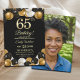 An elegant modern design featuring gold 65th number, balloons with gold and black glitter and a special photo of the birthday person on the back of the invitation. Customize the details for a unique and chic Birthday Celebration.