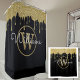 Elegant Black Gold Glitter Drips Monogram Script Shower Curtain