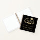 Elegant black and gold graduation party guest book featuring "Class of" in an illustration of laurel wreath incorporating a grad cap and diploma, the graduate's name in a formal script, and "Congratulations" and their school name in classic serif typography.
