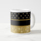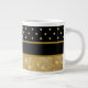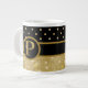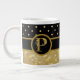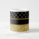 Classy black and gold design featuring a black panel with gold polka dots, and band of black with a decorative P monogram and a gold panel.