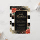 Elegant black and white striped floral 40th birthday invitation featuring a gold frame decorated by gold confetti, red roses and greenery.