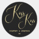 Customisable, elegant black and gold sticker with script typography, "Kiss Kiss" saying and a place for two names. There is also room for two x's, below the names, or they could be replaced with the current year... or even with your baby's name. The font is printed in a gold colour and sits atop a black background. The calligraphy is an elegant, minimal style with a delicate swirl on the capital letters. Great for a Dark and Moody theme. Elegant Black Gold Saying with Customisable Name Classic Round Sticker.
