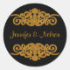 Elegant wedding envelope seal sticker done in jet black, with graphics of gold tone decorations above and below the custom golden yellow text. Personalise the text, with the bride and groom's names or anything you want it to read. Lovely finishing touch to wedding invitation envelopes and thank you cards.