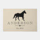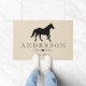 Elegant black horse silhouette in the centre. Tge background has a very small white scalloped pattern over taupe and personalised family name text. This doormat exudes refinement and would make a great impression on your house guests as they are welcomed to your home!