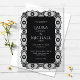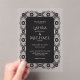 These formal elegant 5" x 7" acrylic wedding invitations feature a black faux lace design with white lettering. The introduction, "Join us in celebrating the wedding of," the wedding couple's full names, wedding date, wedding time, location, location address, and reception information.