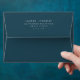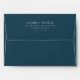 This wedding envelope features a minimalist design with a deep navy blue background and crisp white text, creating an elegant and modern look. The layout is centred, with ample spacing between lines for a clean and balanced appearance. A classic serif font adds a touch of sophistication, making it perfect for formal invitations or announcements. The overall mood is professional and graceful, ideal for couples seeking a timeless and refined aesthetic for their special day.