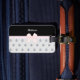 Elegant black pink and silver Luggage tag. Personalised name on black with pink ribbon and diamonds on silver background.