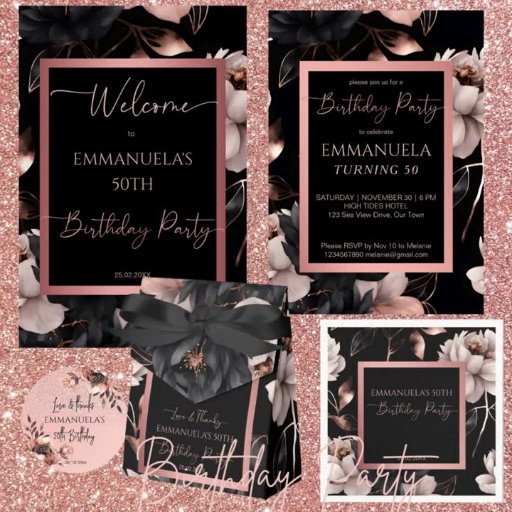 Elegant black rose gold floral birthday template