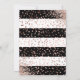 Beautiful black and rose gold floral quinceañera party invitation featuring blush pink roses and rose gold confetti against a black and white striped background.