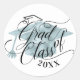 Elegant and classy graduation sticker design featuring the words "Grad Class of" in an elegant classy script style arrangement in black with a graduation cap incorporated into the typographic design and a faux blue foil graduation cap in the background. Customise with your graduation year.
