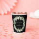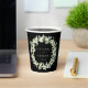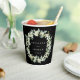 Elegant, black personalised paper cups for wedding celebrations. A double-sided design, featuring hand painted snowberries and eucalyptus arranged into a beautiful botanical wreath. All text is fully editable so you can easily change/delete the message on one or both sides and alter the font style/colour/size. Coordinating items available.